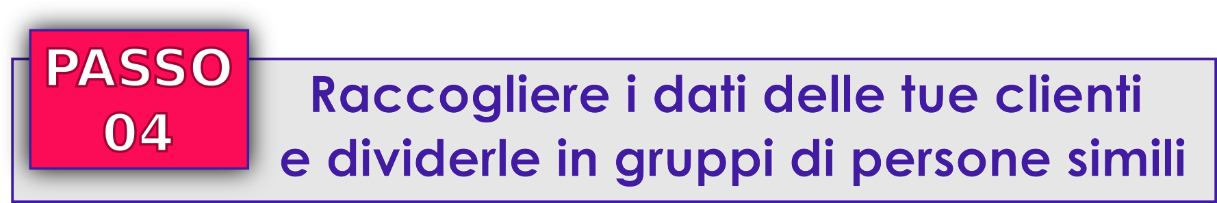 Ci sono tecniche ben precise per riuscire a creare gruppi di clienti che si comportano in modo simile all’interno del tuo centro estetico. 👉 Grazie ai numeri potrai sapere su quale cliente applicare la strategia di marketing più corretta, aumentando le probabilità che le tue iniziative abbiano successo.